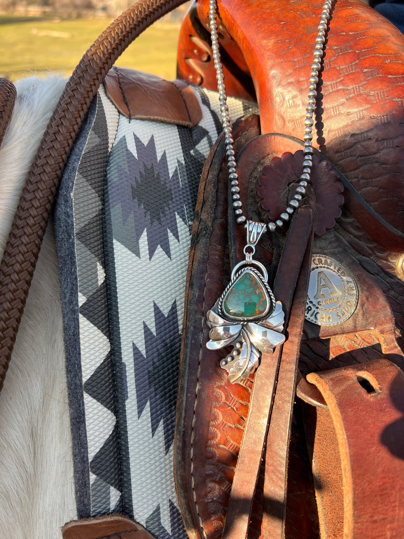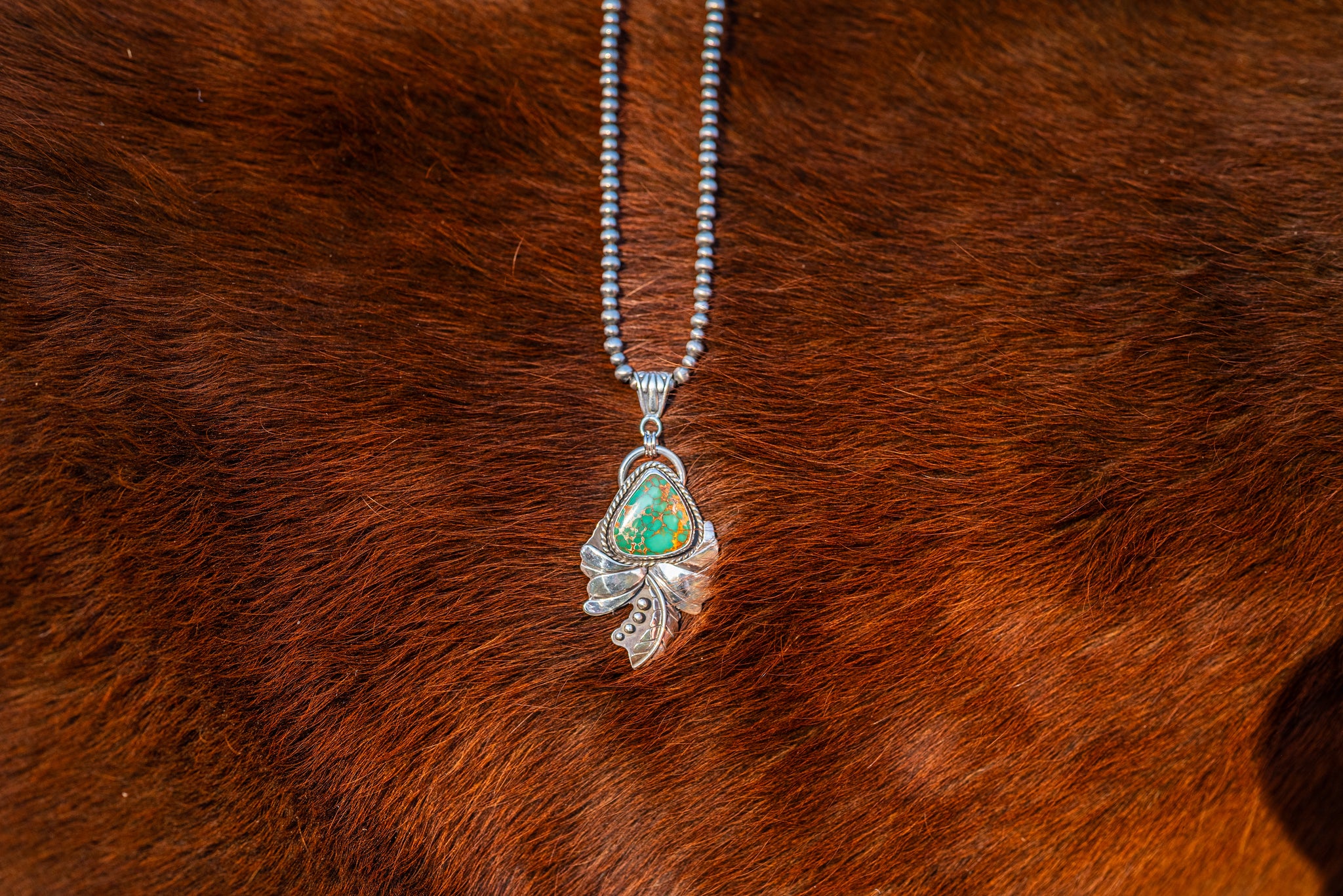 A substantial Natural Royston Turquoise stone adorns the center of this “Leaves + Plumes” Pendant. It’s a one-of-a-kind Handcrafted from Sterling & Fine Silver. ** Price is for the pendant on the bail hanger. Modern Navajo Pearls sold separately.