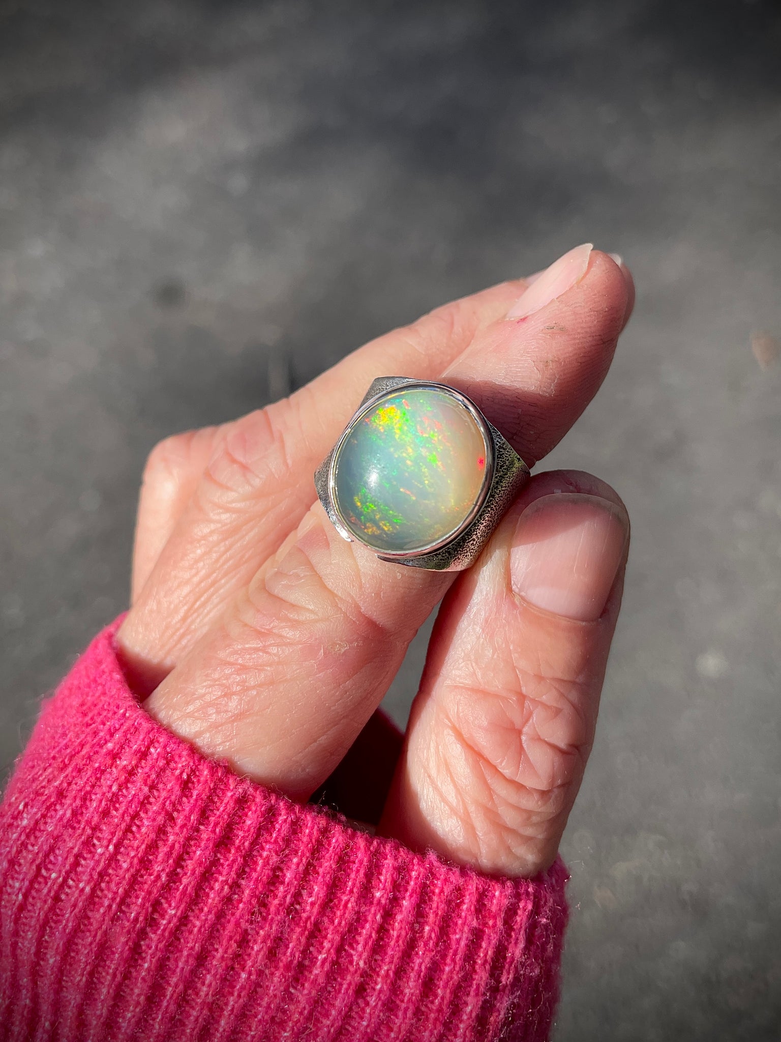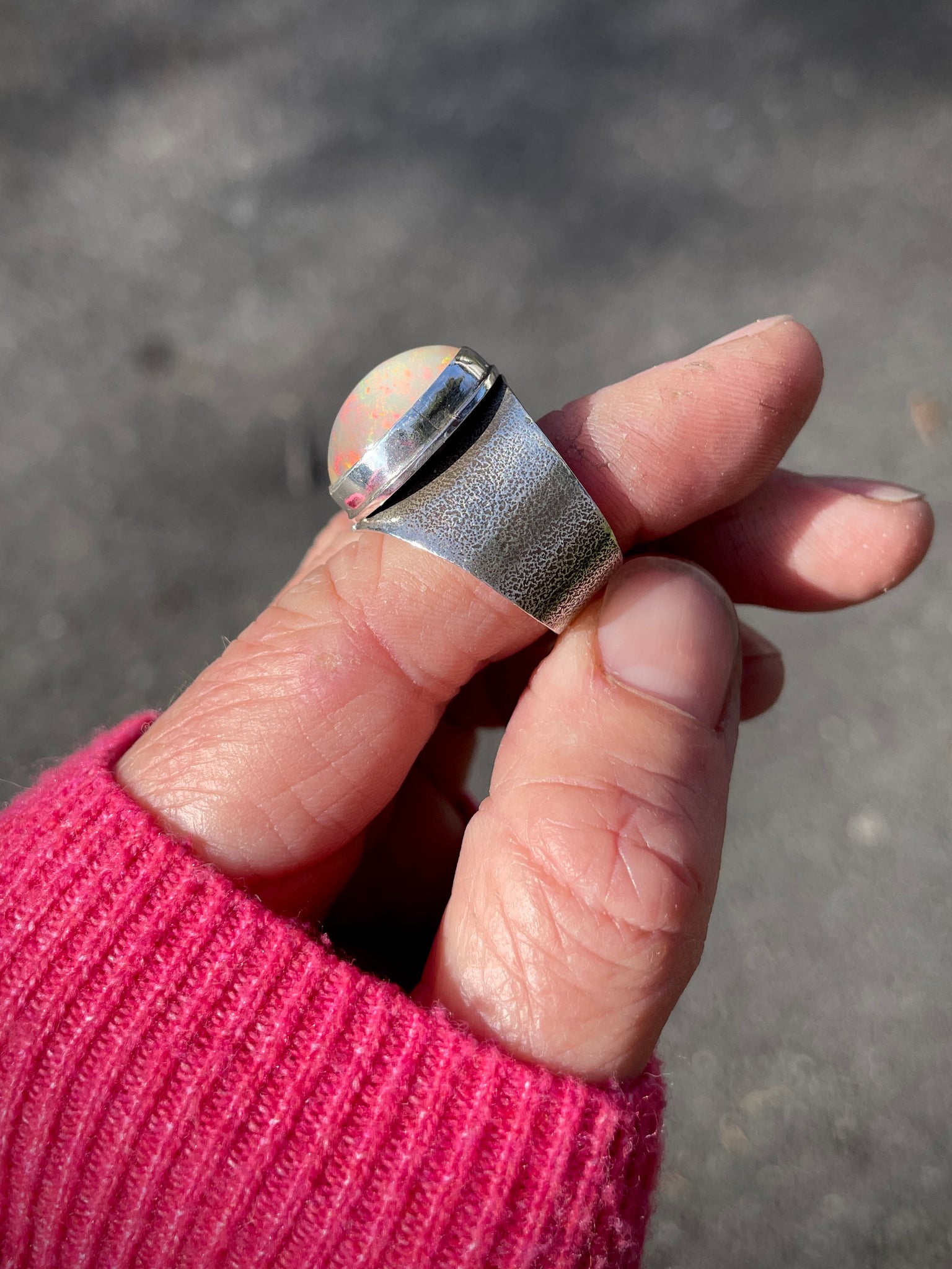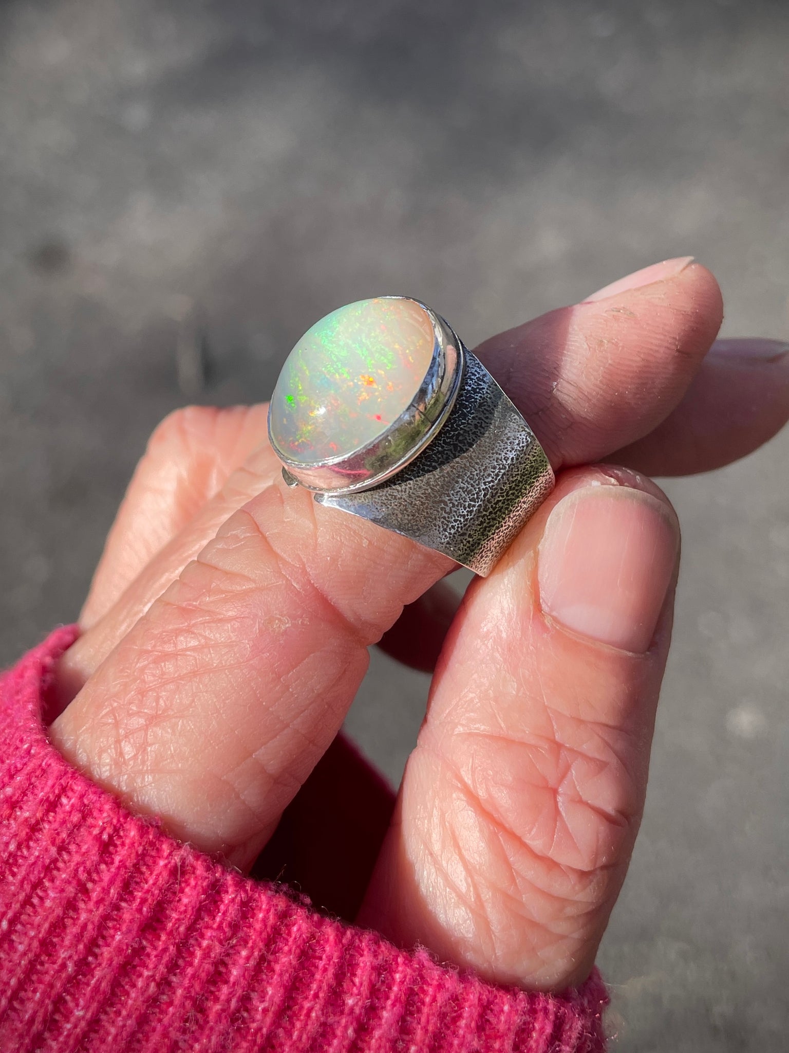 Flashy Welo Opal set into a Handmade Fine + Sterling Silver Ring setting. Wide tapered band, Size 9 on a Mandrel. Can also fit for an 8-8 1/2 because of the wide band if you like a little room.